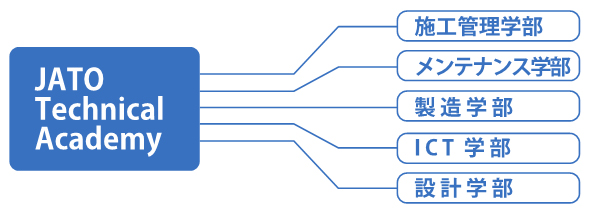施工管理学部/メンテナンス学部/製造学部/ICT学部/設計学部の5学部を設け、1講座1単位として、各自の目標を達成しやすいカリキュラムとします。