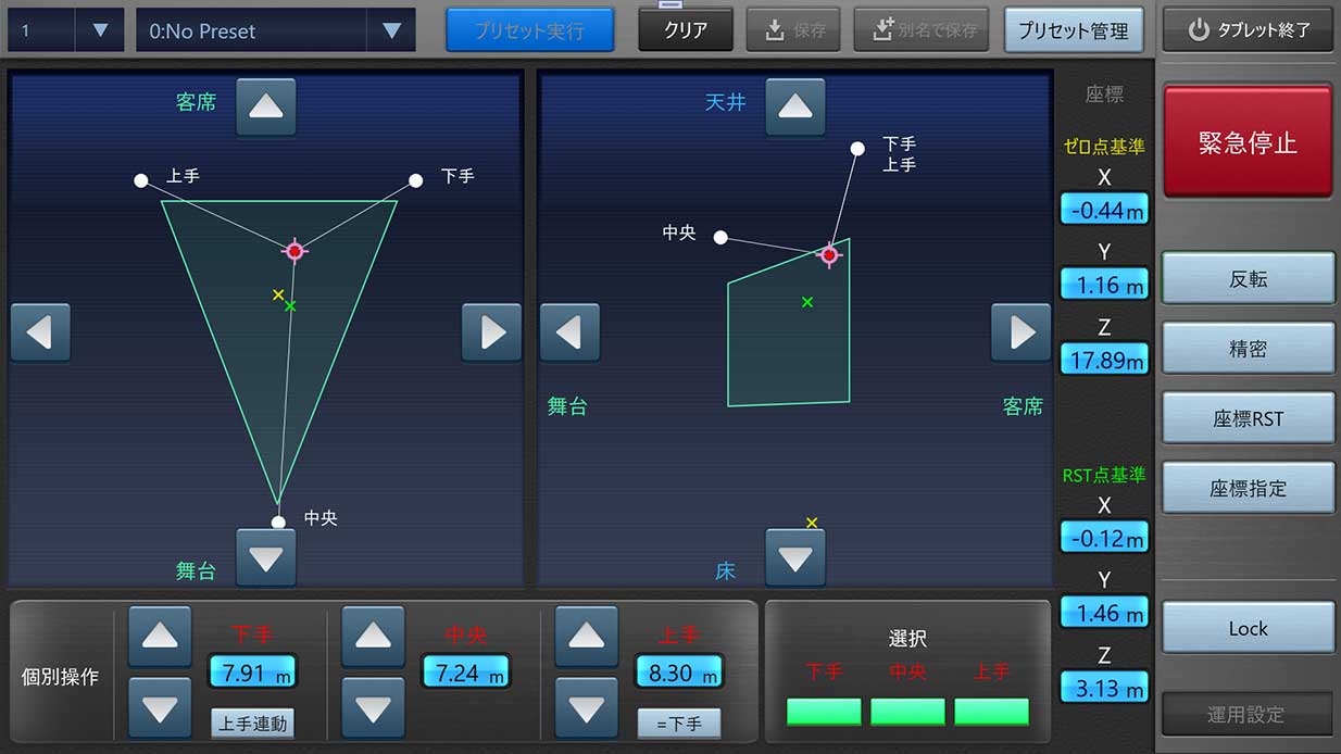 無線LAN接続により、ステージ上や客席の位置からの操作に対応